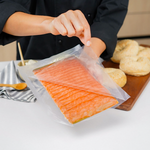 Salmón ahumado en frío corte bacon, producto exclusivo de tienda South Wind. Listo para servir, ideal para desayuno.