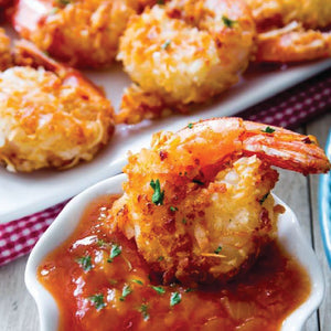 Camarón tamaño mediano, apanado en tempura. Tiene colita, perfecto para tomar con los dedos. Finger food o cocktail. Acompañar con mayonesa siracha o salsa agridulce.