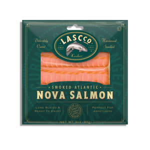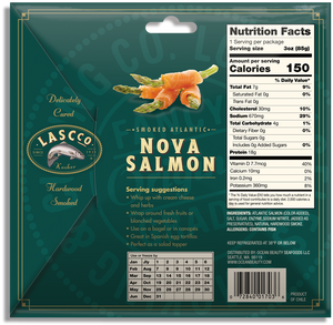 Elaborado para nuestro cliente americano LascCo. Salmón ahumado en frío corte bacon, producto exclusivo de tienda South Wind. Listo para servir, ideal para desayuno.